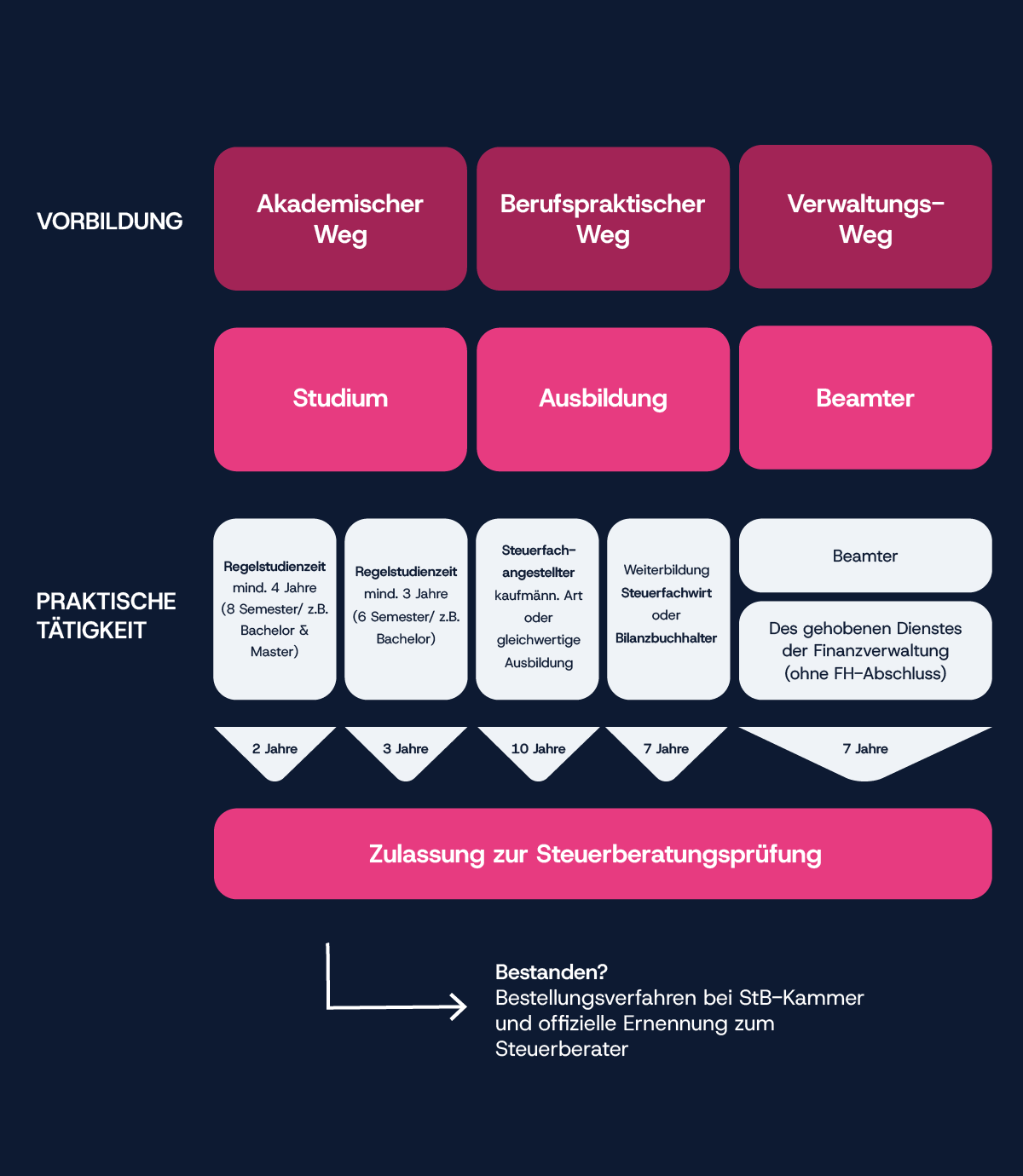 Um zum Steuerberater zu werden, müssen Sie die Steuerberaterprüfung bestehen. Um zur Steuerberaterprüfung zugelassen zu werden, müssen Sie über eine ausreichende Ausbildung oder ein entsprechendes Diplom mit entsprechender Praxiszeit verfügen. Diese hohen Anforderungen haben einen guten Grund: Steuerberater sind Menschen mit besonderem Vertrauen und einem Job, der höchstes Know-how erfordert, denn schlechte Beratung kann fatale Folgen haben.