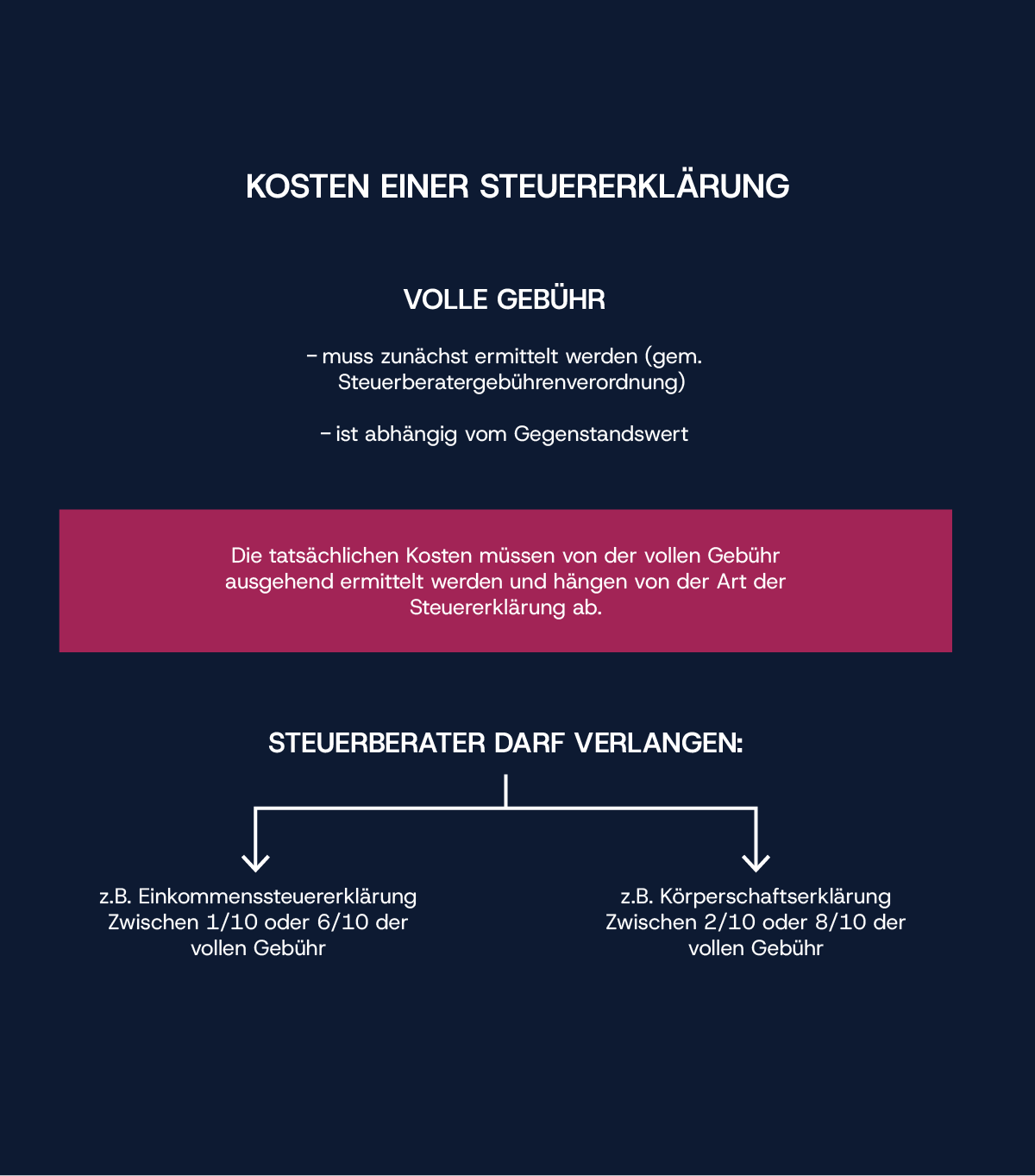 Die Höhe der im Einzelfall anzusetzenden Gebühr richtet sich dabei stets nach dem Gegenstandswert. Die jeweils anwendbaren Faktoren zur Ermittlung der tatsächlich abzurechnenden Gebühren sowie die Gebühren für die Vertretung in gerichtlichen und außergerichtlichen Verfahren sind in den einzelnen Paragrafen der STBVV geregelt.